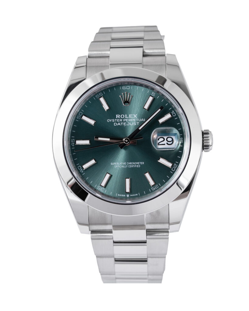 brand: Rolex Reference: 126300 Model: Datejust case MATERIAL: Steel strap: Bracelet case Size (MM): 41mm Dial colour: Green Bezel: Steel Year: 10/2024 Condition: Excellent Box papers : Paperwork/box