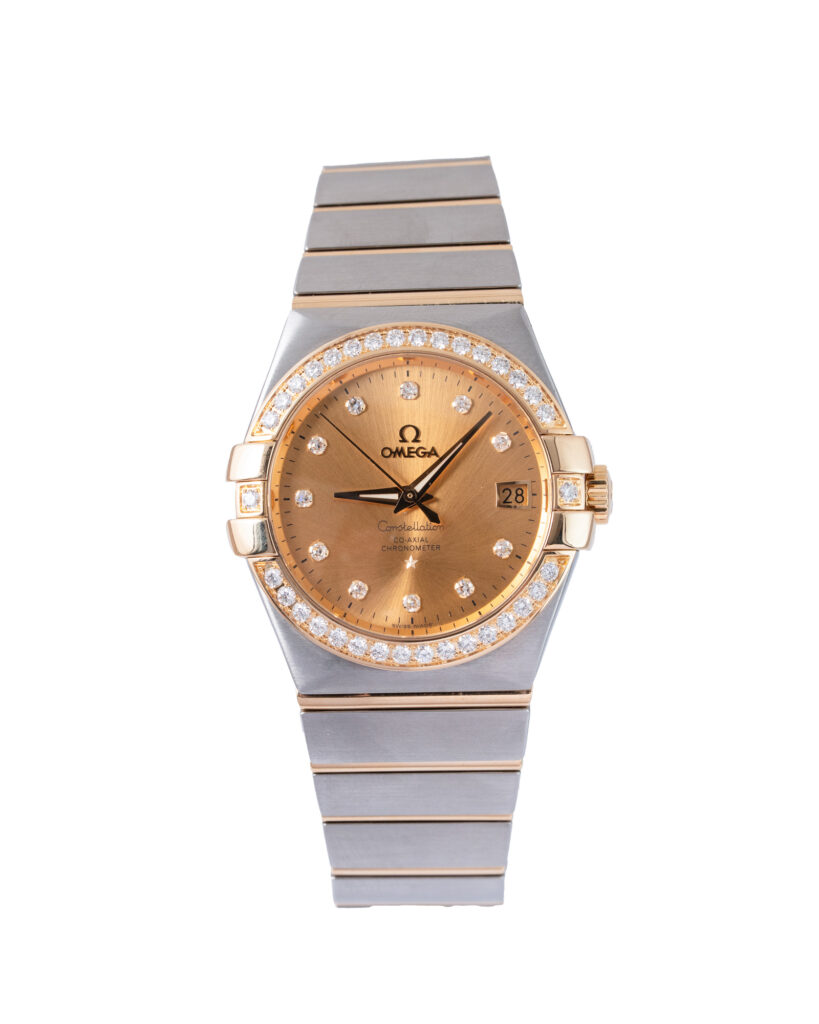 brand: Omega Reference: 12325352058001 Model: Constellation Ladies case MATERIAL: Steel & Yellow Gold strap: Bracelet case Size (MM): 35mm Dial colour: Champagne Bezel: Diamond Condition: Excellent Box papers : Box