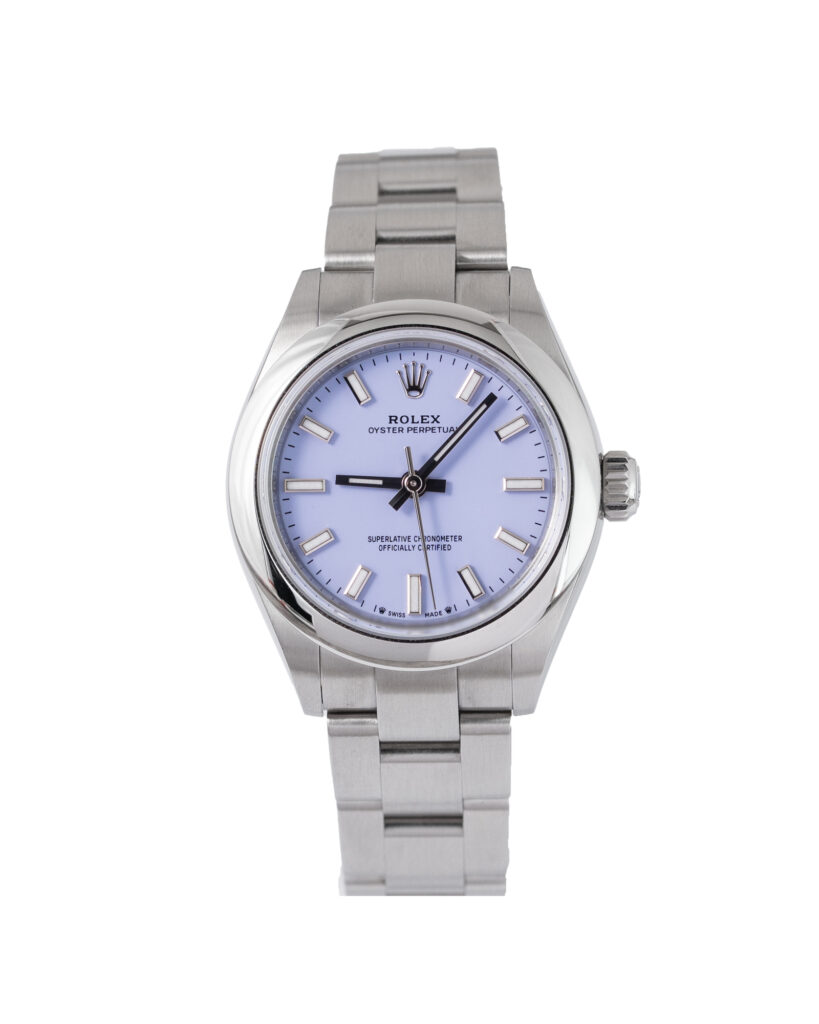 brand: Rolex Reference: 276200 Model: Oyster Perpetual case MATERIAL: Steel strap: Bracelet case Size (MM): 28mm Dial colour: Lavender Bezel: Steel Condition: Unworn Box papers : Paperwork/box