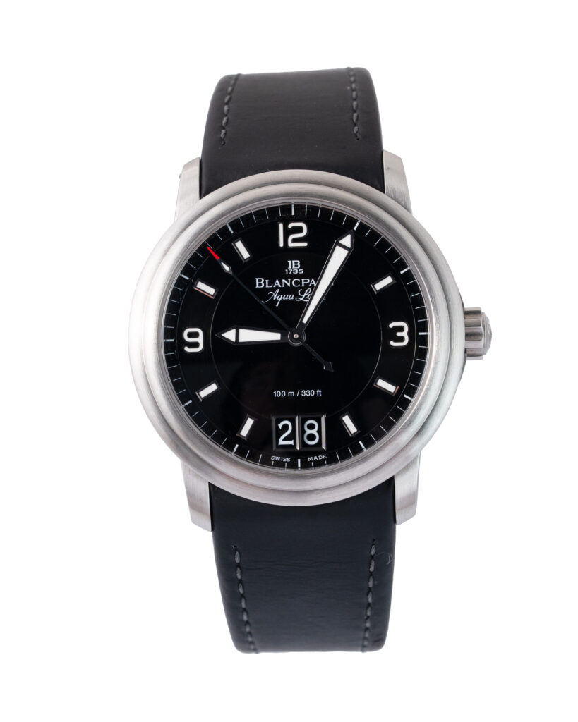 brand: Blancpain Reference: 2850B-1130A-64B Model: Aqua Lung Date case MATERIAL: Steel strap: Leather case Size (MM): 40mm Dial colour: Black Bezel: Steel Year: 05/2007 Condition: Excellent Box papers : Paperwork/box