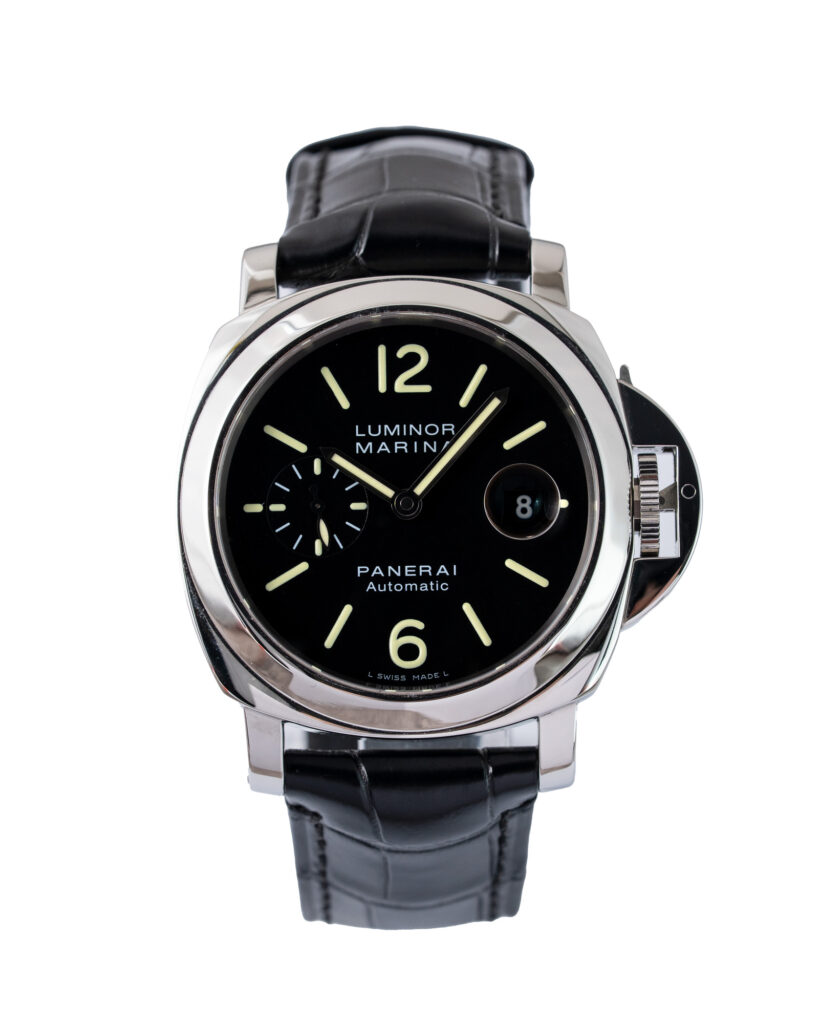 brand: Panerai Reference: 569315 Model: PAM00104 case MATERIAL: Steel strap: Leather case Size (MM): 44mm Dial colour: Black Bezel: Steel Year: 11/2007 Condition: Excellent Box papers : Paperwork/box