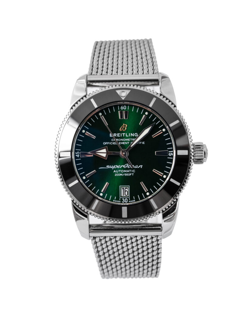brand: Bretiling Reference: AB2010121L1S1 Model: Superocean Heritage II 42 case MATERIAL: Steel strap: Bracelet case Size (MM): 42mm Dial colour: Green Bezel: Ceramic Year: 02/2023 Condition: Excellent Box papers : Paperwork/box