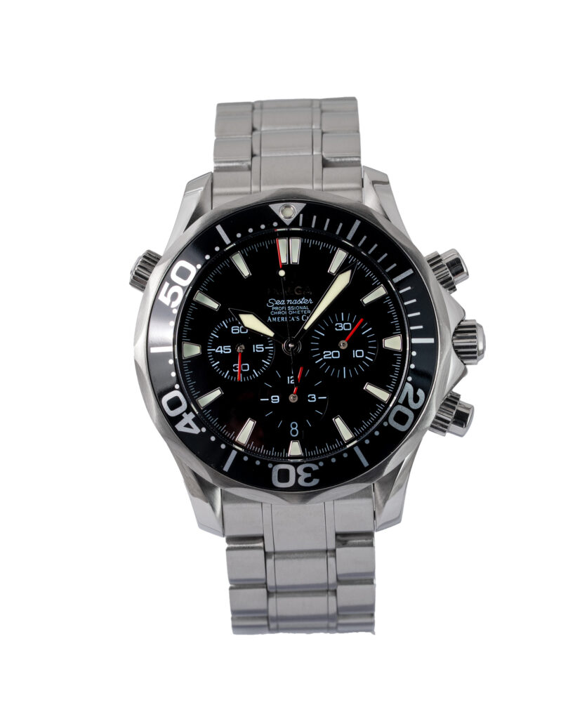 brand: Omega Reference: 25945000 Model: Seamaster Diver 300M Americas Cup case MATERIAL: Steel strap: Bracelet case Size (MM): 41.5mm Dial colour: Black Bezel: Steel Year: 03/2003 Condition: Excellent Box papers : Paperwork/box