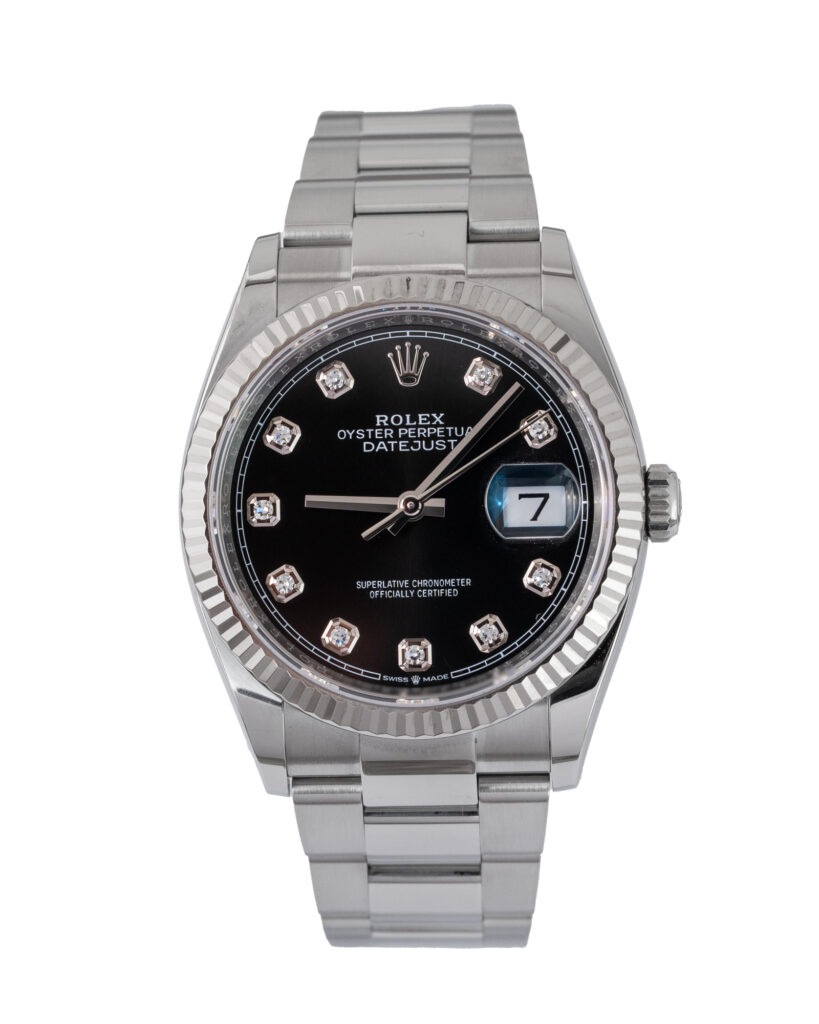 brand: Rolex Reference: 126234 Model: Datejust case MATERIAL: Steel strap: Bracelet case Size (MM): 36mm Dial colour: Black Bezel: White Gold Year: 02/2023 Condition: Excellent Box papers : Paperwork/box