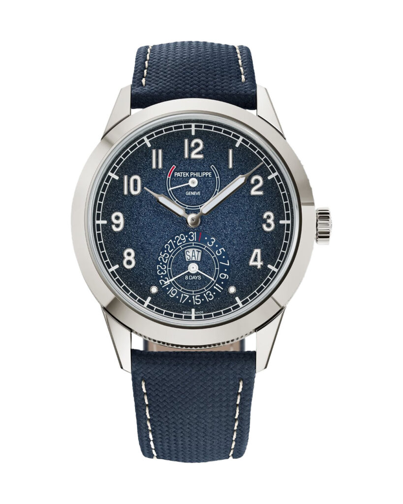 brand: Patek Philippe Reference: 5328G-001 Model: Calatrava case MATERIAL: White Gold strap: Fabric case Size (MM): 41mm Dial colour: Blue Bezel: Steel Condition: Unworn Box papers : Paperwork/box