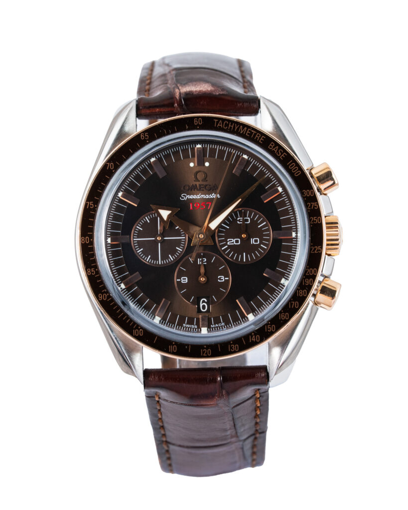 brand: Omega Reference: 321.90.42.50.13.002 Model: Speedmaster Broad Arrow case MATERIAL: Steel & Yellow Gold strap: Leather case Size (MM): 42mm Dial colour: Brown Bezel: Steel Year: 04/2014 Condition: Excellent Box papers : Box