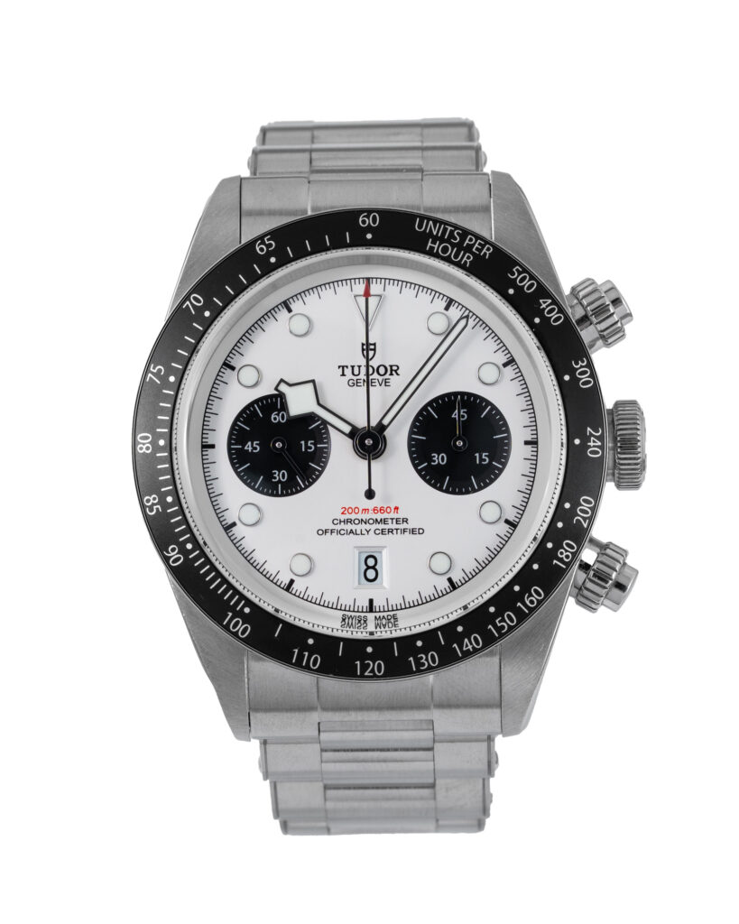 brand: Tudor Reference: 79360N Model: Black Bay Chrono case MATERIAL: Steel strap: Bracelet case Size (MM): 41mm Dial colour: White Bezel: Steel Year: 11/2022 Condition: Excellent Box papers : Paperwork/box