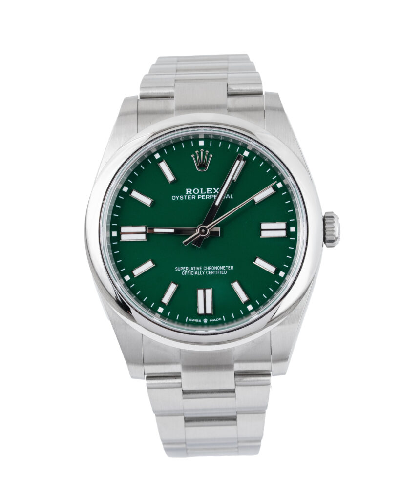 brand: Rolex Reference: 124300 Model: Oyster Perpetual case MATERIAL: Steel strap: Bracelet case Size (MM): 41mm Dial colour: Green Bezel: Steel Year: 09/2024 Condition: Excellent Box papers : Paperwork/box