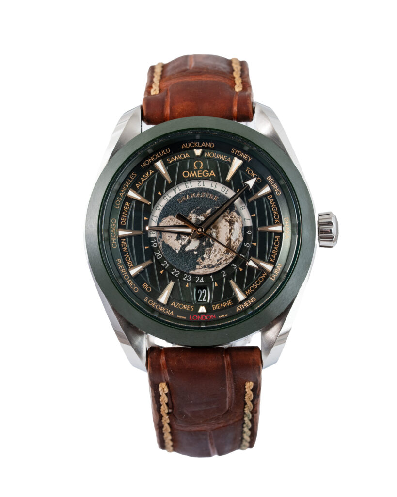 brand: Omega Reference: 220.30.43.22.10.001 Model: Seamaster Aquaterra World Timer case MATERIAL: Steel strap: Bracelet case Size (MM): 43mm Dial colour: Green Bezel: Steel Condition: Excellent Box papers : Paperwork/box