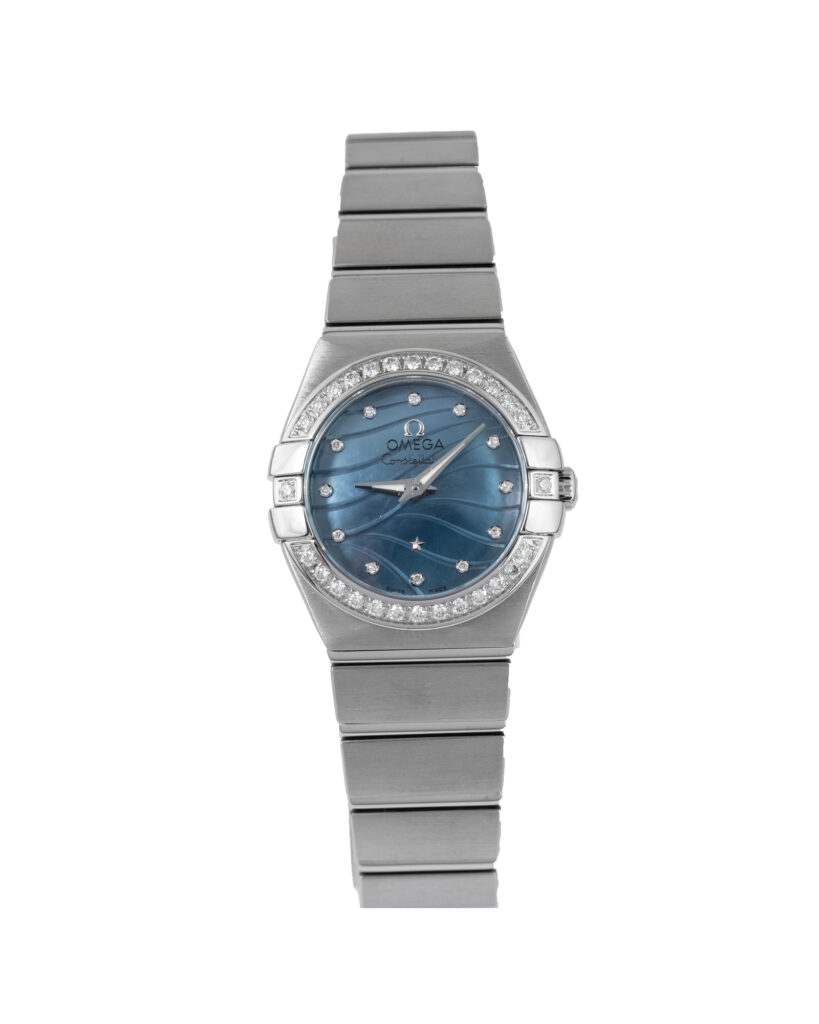 brand: Omega Reference: 123.15.24.60.57.001 Model: Ladies Constellation case MATERIAL: Steel strap: Bracelet case Size (MM): 24mm Dial colour: Blue Bezel: Diamond Year: 02/2015 Condition: Excellent Box papers : Paperwork/box