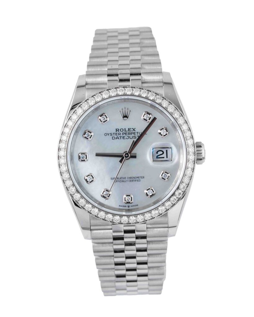 brand: Rolex Reference: 126284RBR Model: Datejust case MATERIAL: Steel strap: Bracelet case Size (MM): 36mm Dial colour: Mother Of Pearl Bezel: White Gold Year: 06/2020 Condition: Excellent Box papers : Paperwork/box