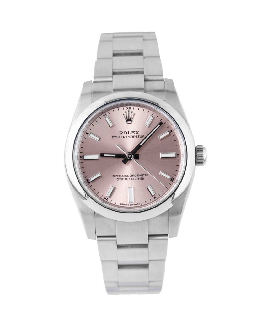 brand: Rolex Reference: 124200 Model: Oyster Perpetual case MATERIAL: Steel strap: Bracelet case Size (MM): 34mm Dial colour: Pink Bezel: Steel Year: 10/2022 Condition: Unworn Box papers : Paperwork/box