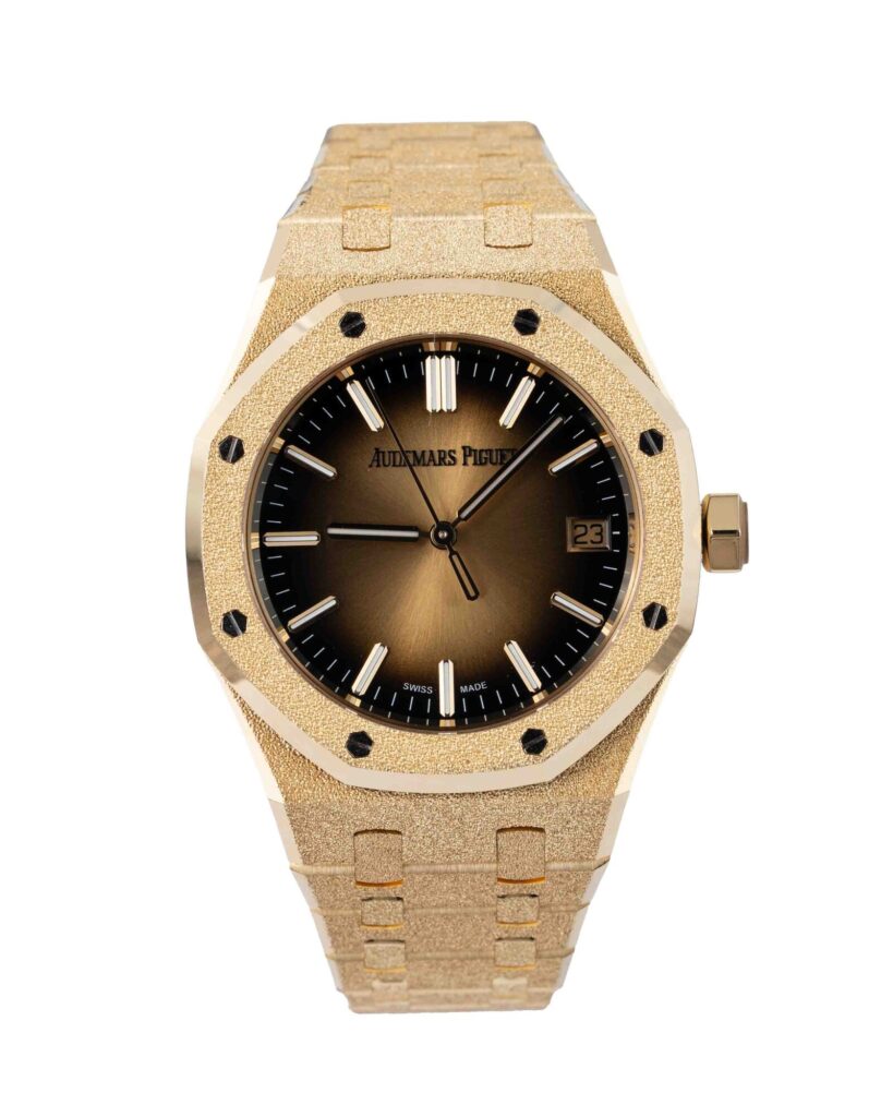 brand: Audemars Piguet Reference: 15550BA.GG.1356BA.01 Model: Royal Oak case MATERIAL: Yellow Gold strap: Bracelet case Size (MM): 37mm Dial colour: Brown Bezel: Yellow Gold Year: 06/2025 Condition: Unworn Box papers : Paperwork/box
