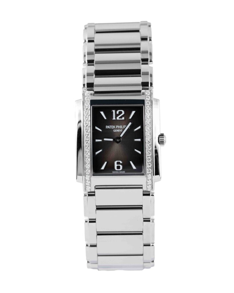 brand: Patek Philippe Reference: 4910/1200A-010 Model: TWENTY~4 case MATERIAL: Steel strap: Bracelet case Size (MM): 25.1mm Dial colour: Grey Bezel: Steel Condition: Unworn Box papers : Paperwork/box