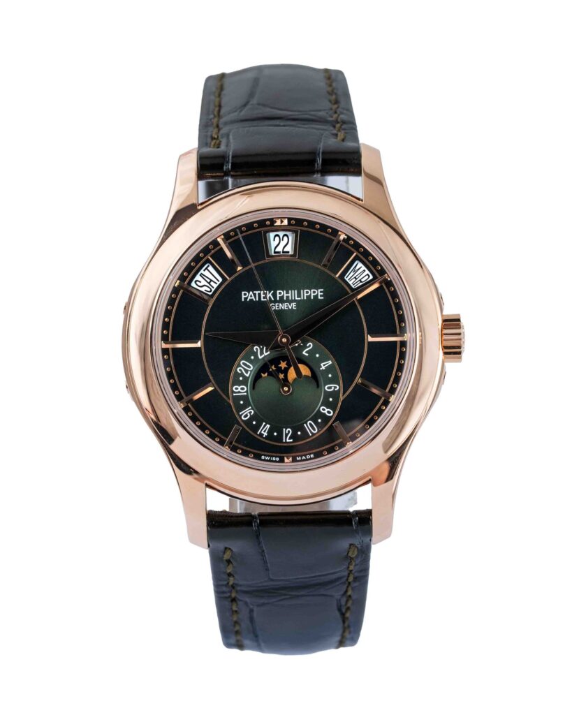 brand: Patek Philippe Reference: 5205R-011 Model: Annual Calendar case MATERIAL: Rose Gold strap: Leather case Size (MM): 40mm Dial colour: Green Bezel: Rose Gold Condition: Unworn Box papers : Paperwork/box