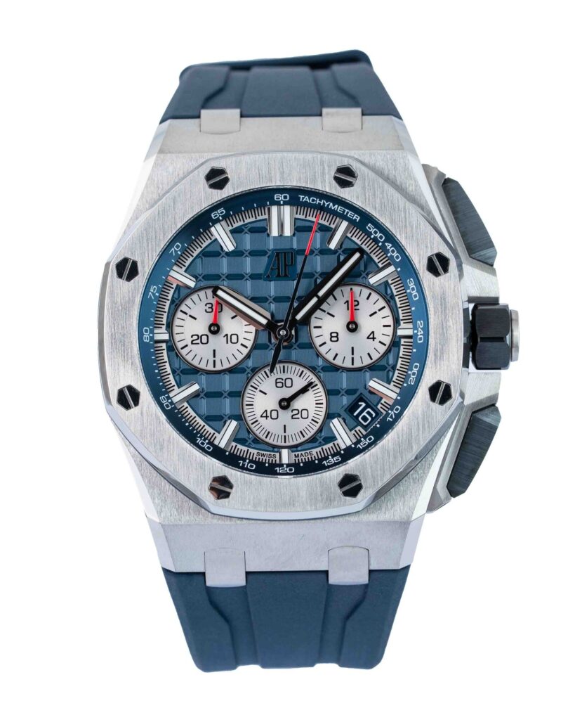 brand: Audemars Piguet Reference: 26420TI.OO.A027CA.01 Model: Royal Oak Offshore case MATERIAL: Titanium strap: Rubber case Size (MM): 43mm Dial colour: Blue Bezel: Titanium Year: 03/2023 Condition: Excellent Box papers : Paperwork/box