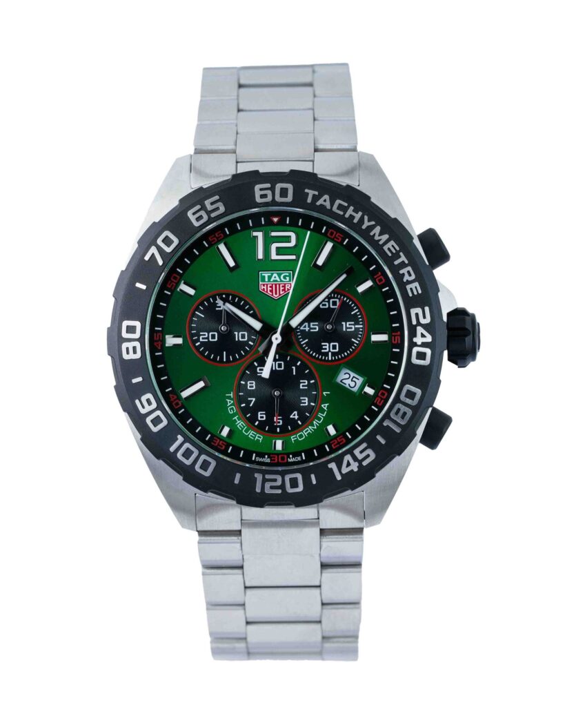 brand: Tag Heuer Reference: CAZ101AP.BA0842 Model: Formula 1 case MATERIAL: Steel strap: Bracelet case Size (MM): 43mm Dial colour: Green Bezel: Polylite Condition: Excellent Box papers : Paperwork/box