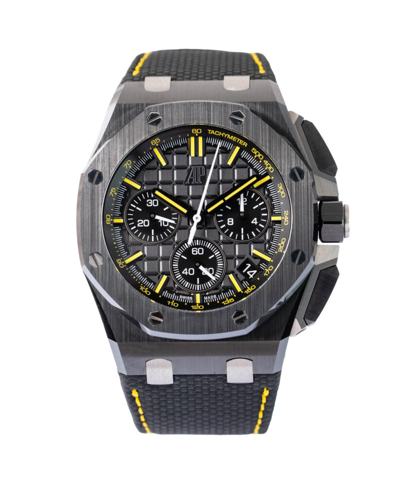 brand: Audemars Piguet Reference: 26420CE.OO.A005VE.01 Model: Royal Oak Offshore Chronograph case MATERIAL: Ceramic strap: Fabric case Size (MM): 43mm Dial colour: Black Bezel: Ceramic Condition: Excellent Box papers : Paperwork/box