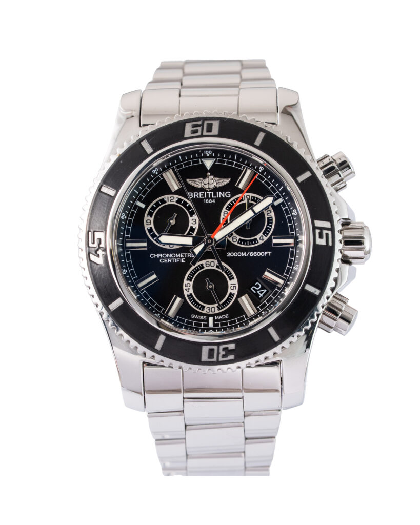 brand: Breitling Reference: A73310A8 Model: Superocean Chronograph case MATERIAL: Steel strap: Bracelet case Size (MM): 46mm Dial colour: Black Bezel: Steel Year: 04/2015 Condition: Excellent Box papers : Paperwork/box
