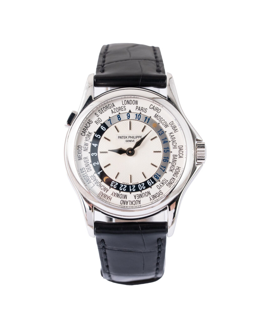 brand: Patek Philippe Reference: 5110G-001 Model: World Time case MATERIAL: White Gold strap: Leather case Size (MM): 37mm Dial colour: White Bezel: White Gold Condition: Excellent Box papers : Paperwork/box