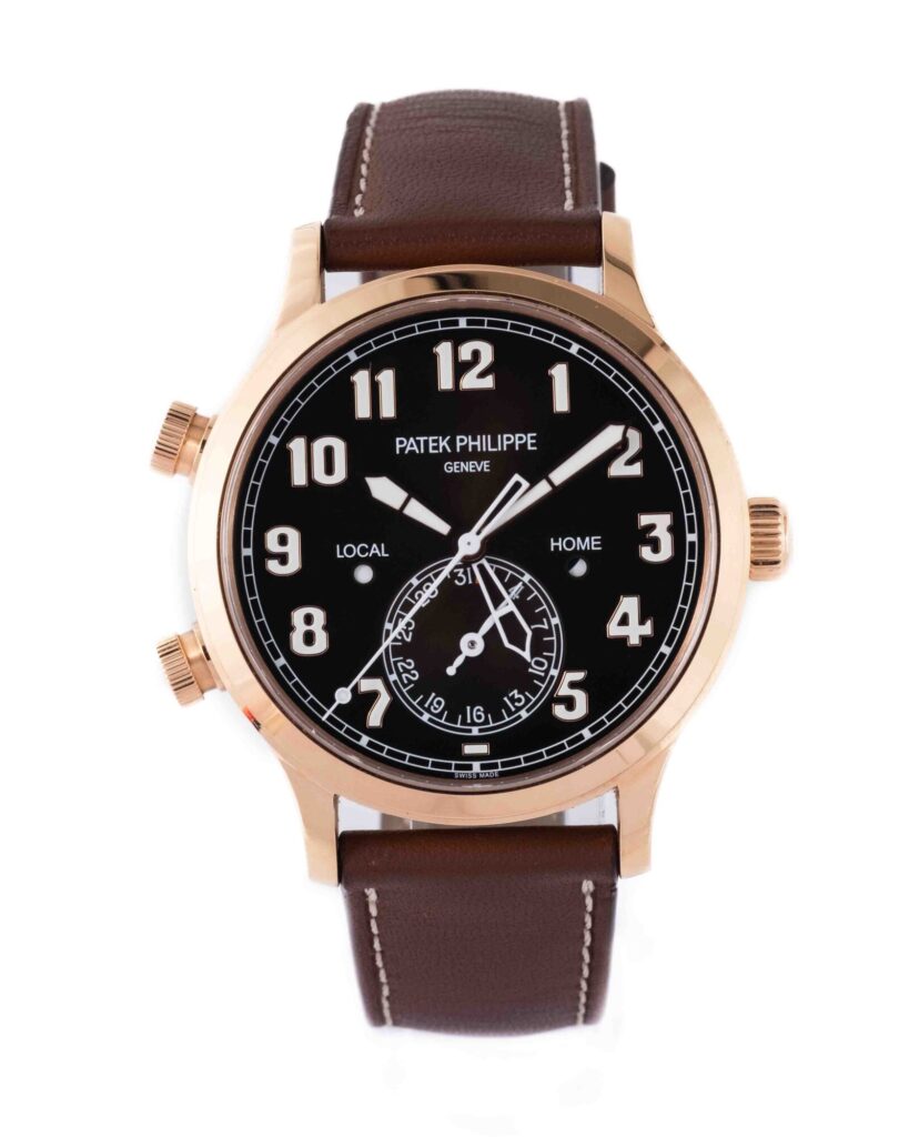 brand: Patek Philippe Reference: 5524R-001 Model: Travel Time case MATERIAL: Rose Gold strap: Leather case Size (MM): 42mm Dial colour: Brown Bezel: Rose Gold Year: 09/2020 Condition: Excellent Box papers : Paperwork/box