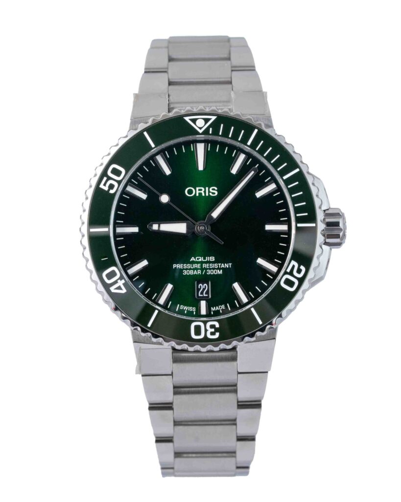 brand: Oris Reference: 0173377664157 Model: Aquis Date case MATERIAL: Steel strap: Bracelet case Size (MM): 41.5mm Dial colour: Green Bezel: Ceramic Year: 05/2024 Condition: Unworn Box papers : Paperwork/box