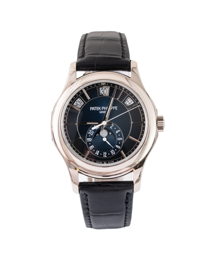 brand: Patek Philippe Reference: 5205G-013 Model: Annual Calendar case MATERIAL: White Gold strap: Leather case Size (MM): 40mm Dial colour: Blue Bezel: White Gold Year: 10/2024 Condition: Excellent Box papers : Paperwork/box