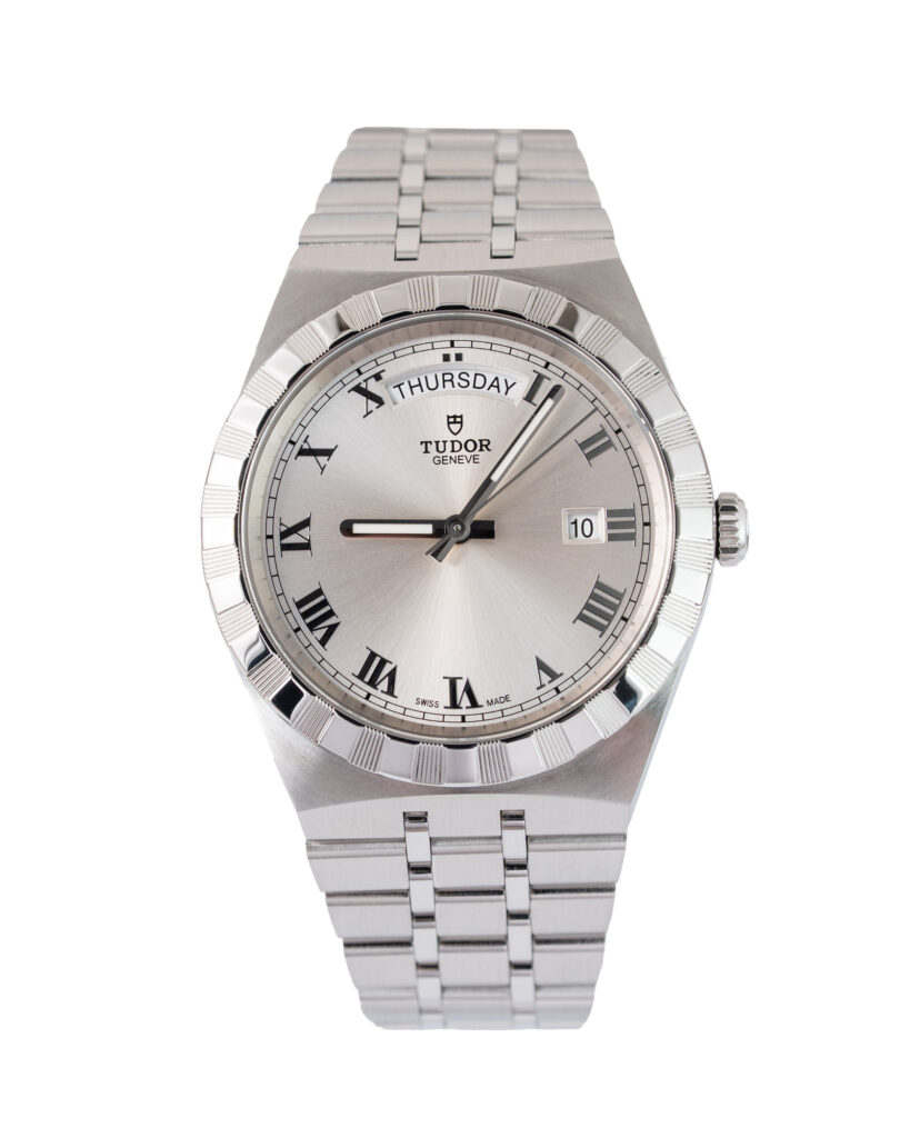 brand: Tudor Reference: 28600 Model: Royal case MATERIAL: Steel strap: Bracelet case Size (MM): 41mm Dial colour: Silver Bezel: Steel Year: 05/2023 Condition: Excellent Box papers : Paperwork/box
