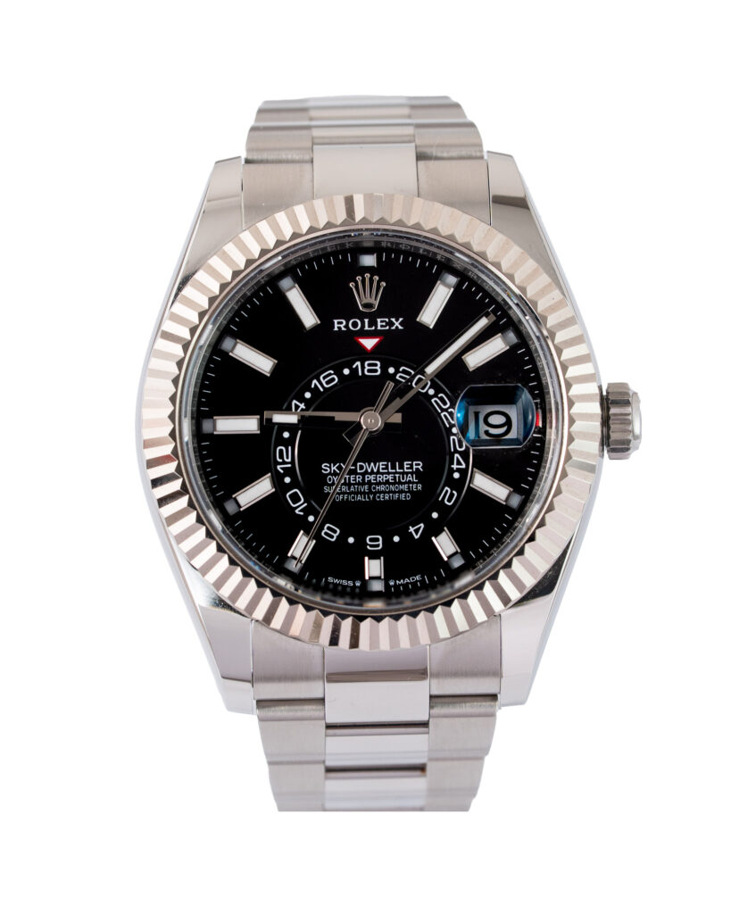 brand: Rolex Reference: 336934 Model: Sky-Dweller case MATERIAL: Steel strap: Bracelet case Size (MM): 42mm Dial colour: Black Bezel: White Gold Year: 07/2025 Condition: Excellent Box papers : Paperwork/box