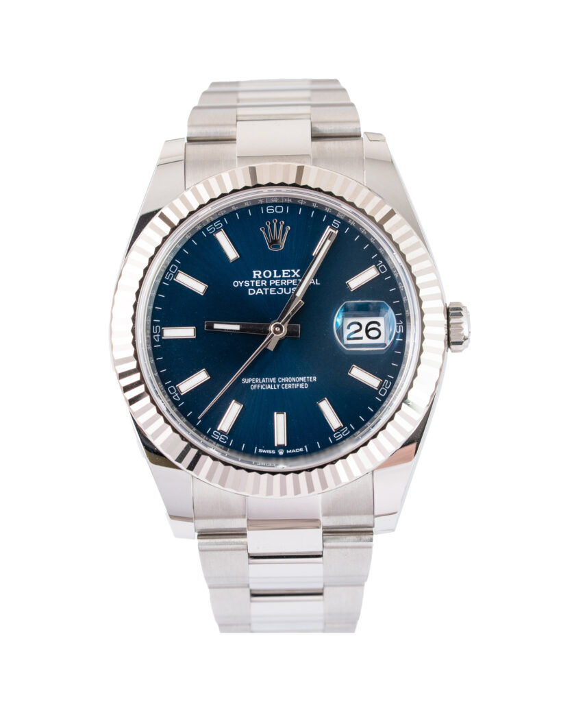 brand: Rolex Reference: 126334 Model: Datejust case MATERIAL: Steel strap: Bracelet case Size (MM): 41mm Dial colour: Blue Bezel: White Gold Year: 06/2020 Condition: Unworn Box papers : Paperwork/box