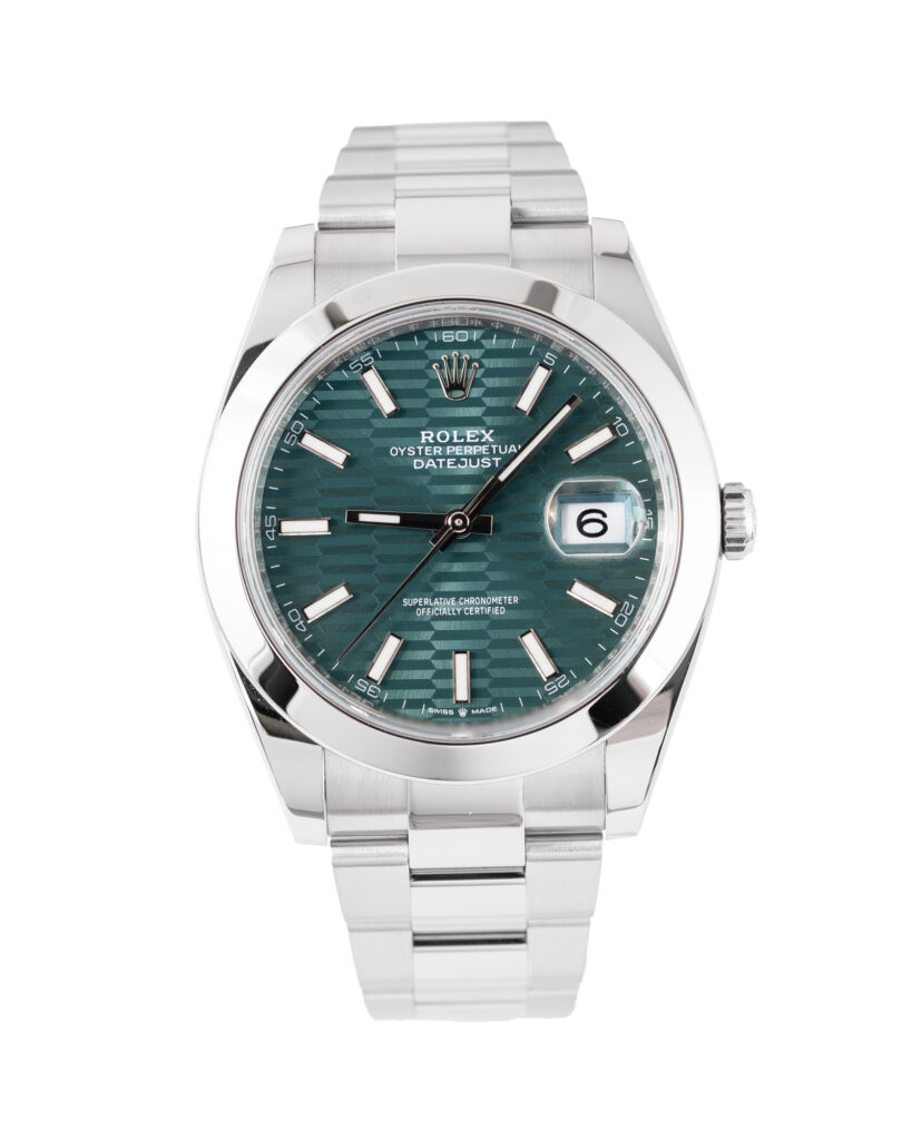 brand: Rolex Reference: 126300 Model: Datejust case MATERIAL: Steel strap: Bracelet case Size (MM): 41mm Dial colour: Green Bezel: Steel Year: 11/2023 Condition: Excellent Box papers : Paperwork/box