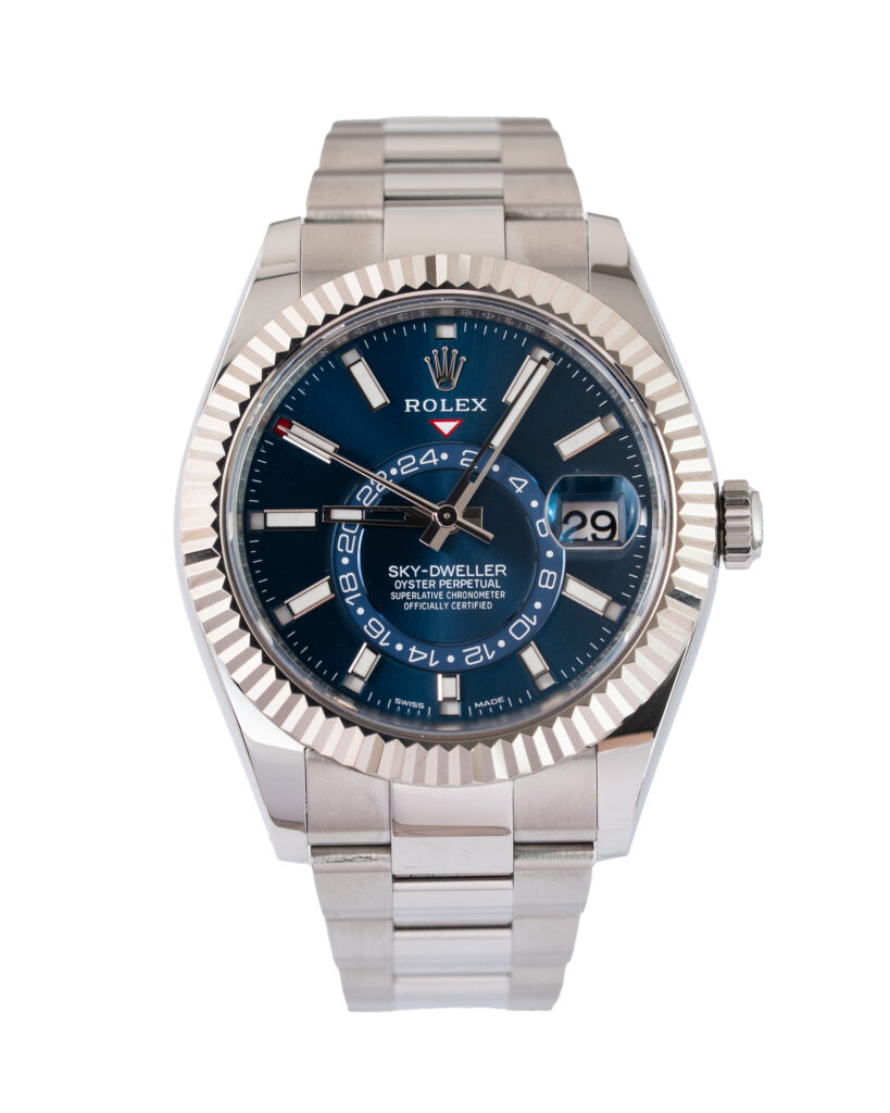 brand: Rolex Reference: 326934 Model: Sky-Dweller case MATERIAL: Steel case Size (MM): 42mm Dial colour: Blue Condition: Excellent Box papers : Paperwork/box