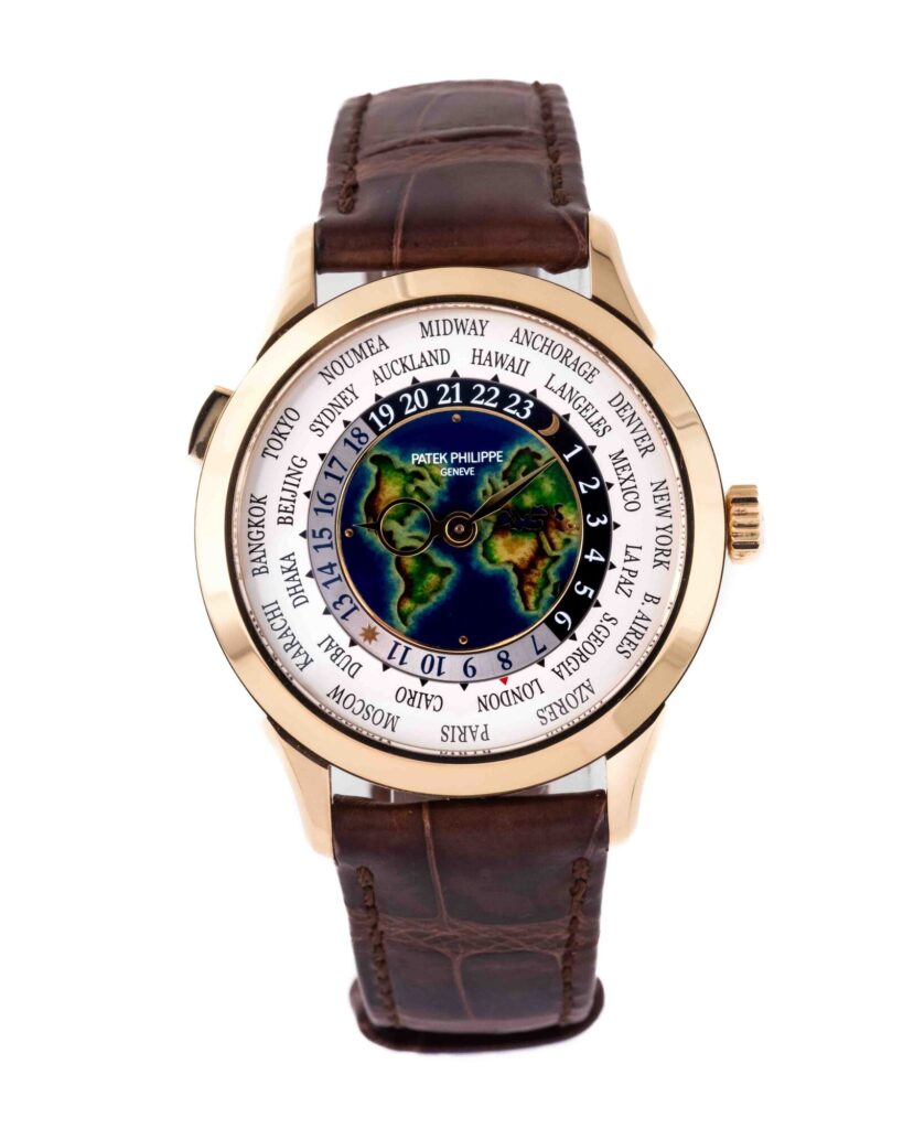 brand: Patek Philippe Reference: 5231J-001 Model: World Time case MATERIAL: Yellow Gold strap: Leather case Size (MM): 38mm Dial colour: White Bezel: Yellow Gold Year: 11/2019 Condition: Excellent Box papers : Paperwork/box