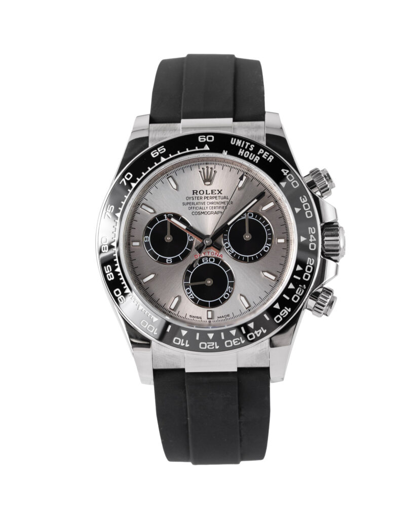 brand: Rolex Reference: 126519LN Model: Daytona case MATERIAL: White Gold strap: Rubber case Size (MM): 40mm Dial colour: Grey Bezel: Ceramic Year: 10/2024 Condition: Excellent Box papers : Paperwork/box