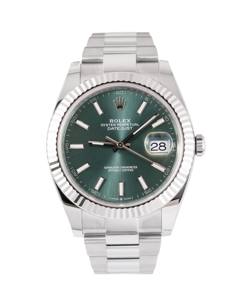 brand: Rolex Reference: 126334 Model: Datejust case MATERIAL: Steel strap: Bracelet case Size (MM): 41mm Dial colour: Green Bezel: White Gold Year: 12/2025 Condition: Unworn Box papers : Paperwork/box