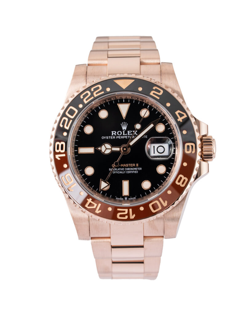 brand: Rolex Reference: 126715CHNR Model: GMT-Master II case MATERIAL: Rose Gold strap: Bracelet case Size (MM): 40mm Dial colour: Black Bezel: Ceramic Year: 02/2021 Condition: Excellent Box papers : Paperwork/box