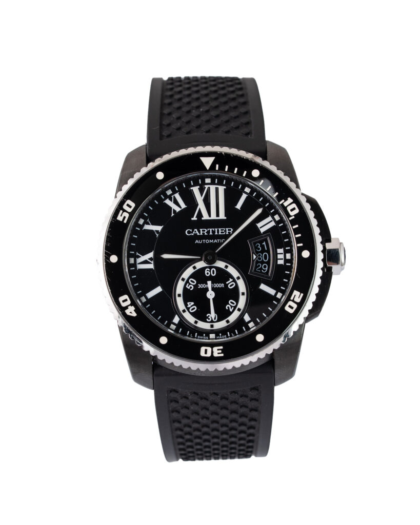 brand: Cartier Reference: 3729 Model: Calibre De Cartier Diver case MATERIAL: Steel strap: Rubber case Size (MM): 42mm Dial colour: Black Bezel: Ceramic Condition: Good Box papers : Watch Only