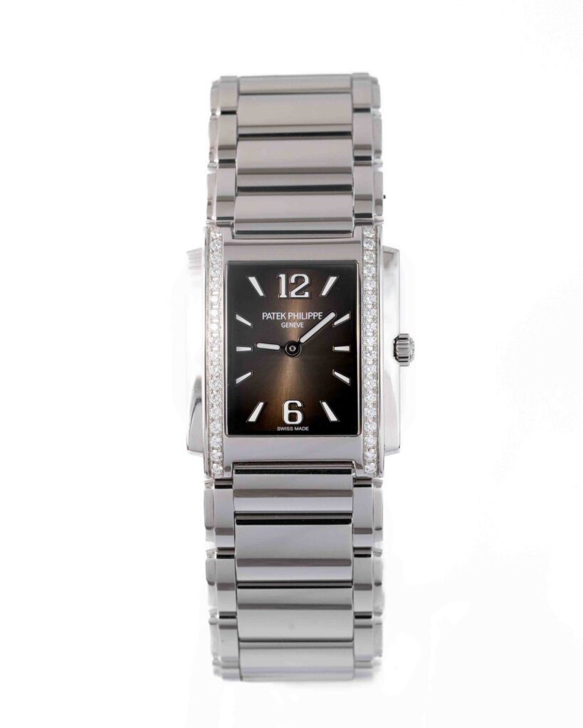 brand: Patek Philippe Reference: 4910/1200A-010 Model: Twenty Four case MATERIAL: Steel strap: Bracelet case Size (MM): 25.1mm Dial colour: Brown Bezel: Diamond Year: 06/2024 Condition: Excellent Box papers : Paperwork/box