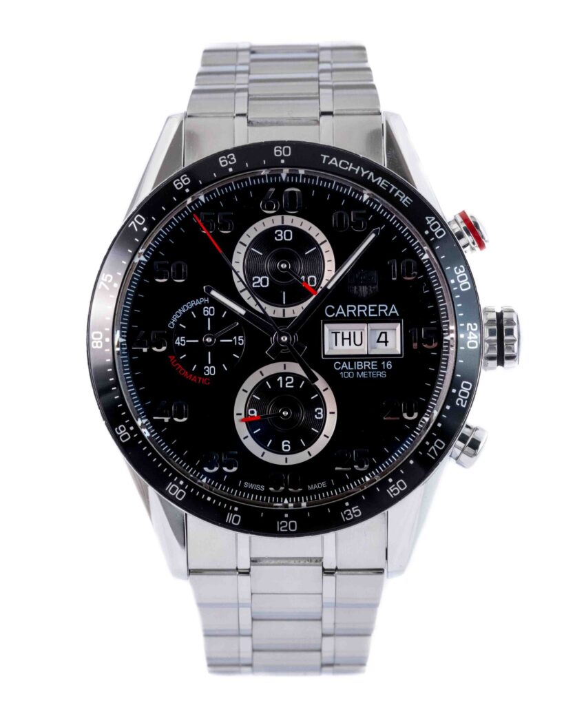 brand: Tag Heuer Reference: CV2A10 Model: Carrera Calibre 16 case MATERIAL: Steel strap: Bracelet case Size (MM): 43mm Dial colour: Black Bezel: Steel Condition: Excellent Box papers : Box
