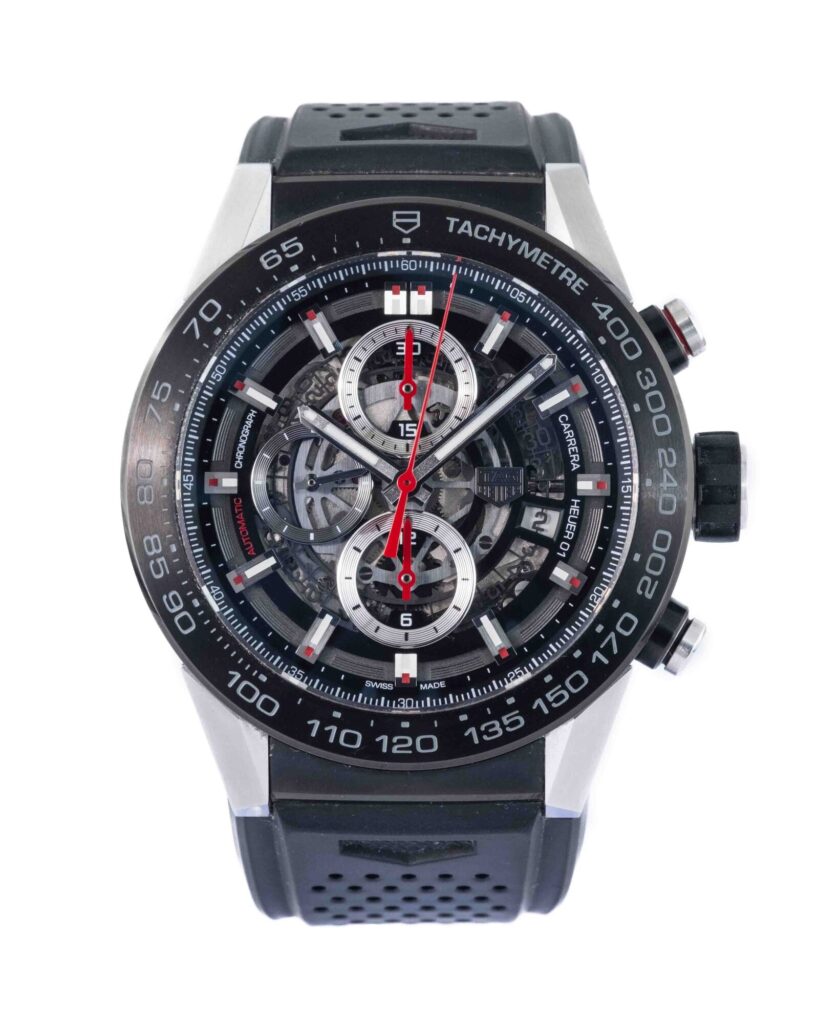brand: Tag Heuer Reference: CAR2A1Z Model: Carrera Calibre Heuer 01 case MATERIAL: Pvd strap: Rubber case Size (MM): 45mm Dial colour: Skeleton Bezel: Ceramic Year: 12/2019 Condition: Excellent Box papers : Paperwork/box