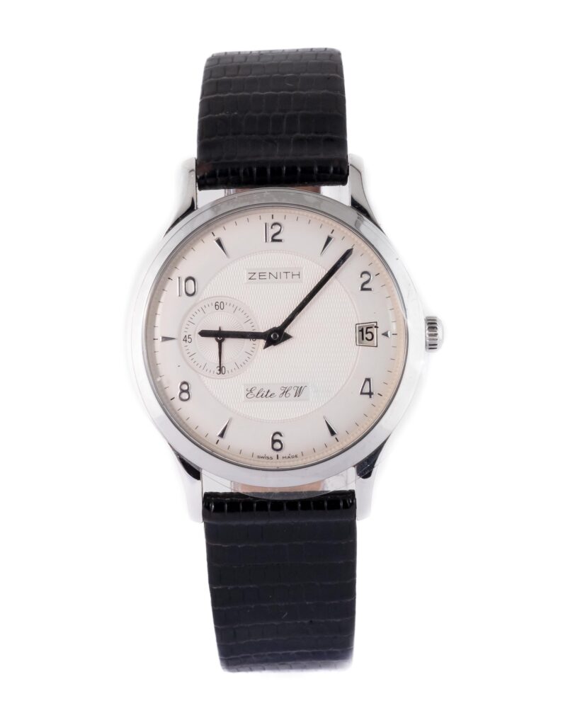 brand: Zenith Reference: 01.1125.650 Model: Elite case MATERIAL: Steel strap: Leather case Size (MM): 37mm Dial colour: Silver Bezel: Steel Year: 08/2008 Condition: Excellent Box papers : Paperwork/box