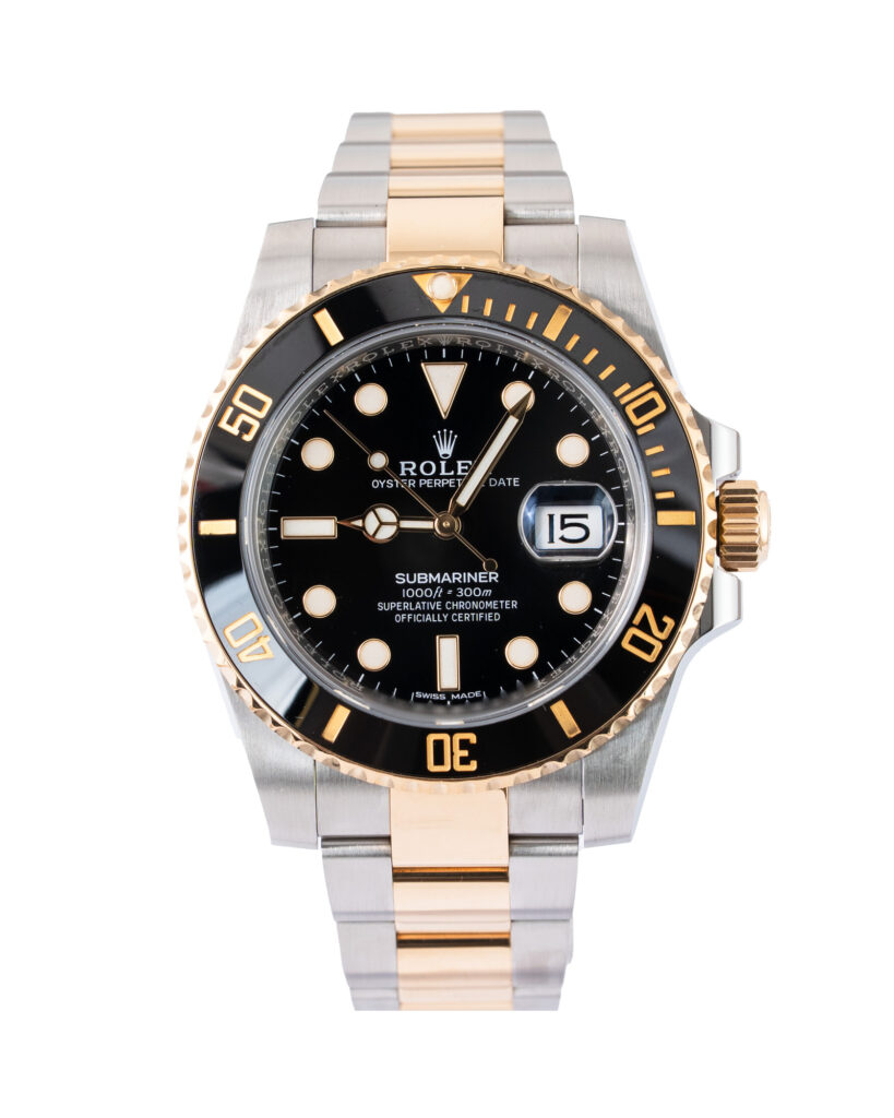 brand: Rolex Reference: 116613LN Model: Submariner case MATERIAL: Steel & Yellow Gold strap: Bracelet case Size (MM): 40mm Dial colour: Black Bezel: Ceramic Condition: Excellent Box papers : Paperwork/box