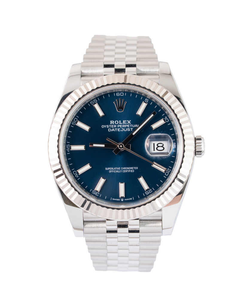 brand: Rolex Reference: 126334 Model: Datejust case MATERIAL: Steel strap: Bracelet case Size (MM): 41mm Dial colour: Blue Bezel: White Gold Condition: Excellent Box papers : Paperwork/box