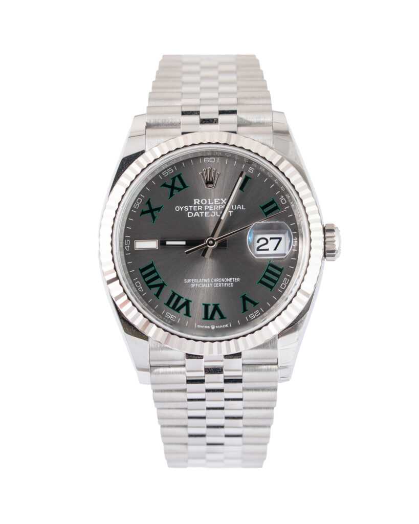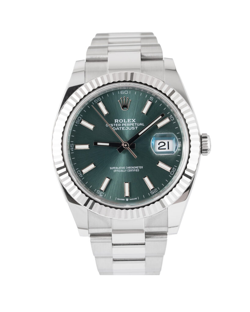 brand: Rolex Reference: 126334 Model: Datejust case MATERIAL: Steel strap: Bracelet case Size (MM): 41mm Dial colour: Green Bezel: White Gold Condition: Excellent Box papers : Paperwork/box