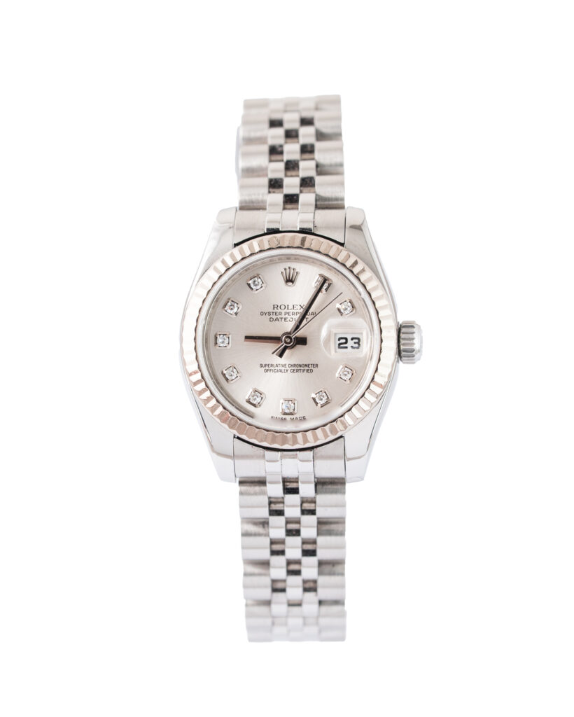 brand: Rolex Reference: 179174 Model: Datejust case MATERIAL: Steel strap: Bracelet case Size (MM): 26mm Dial colour: Silver Bezel: White Gold Condition: Excellent Box papers : Paperwork/box
