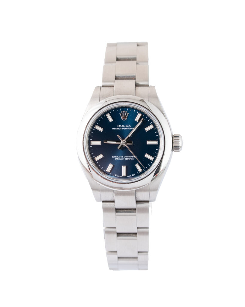 brand: Rolex Reference: 276200 Model: Oyster Perpetual case MATERIAL: Steel strap: Bracelet case Size (MM): 28mm Dial colour: Blue Bezel: Steel Condition: Excellent Box papers : Paperwork/box