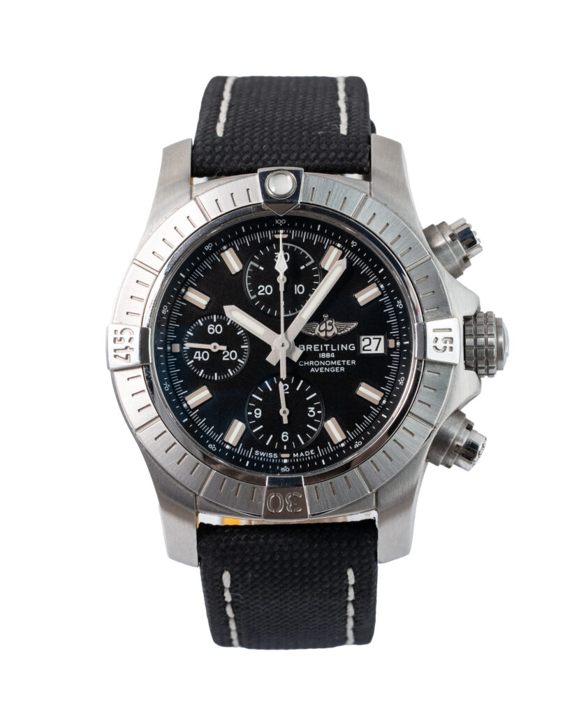 brand: Breitling Reference: A13385101B1X2 Model: Avenger Chrono 43 case MATERIAL: Steel strap: Fabric case Size (MM): 43mm Dial colour: Black Bezel: Steel Year: 09/2024 Condition: Excellent Box papers : Paperwork/box