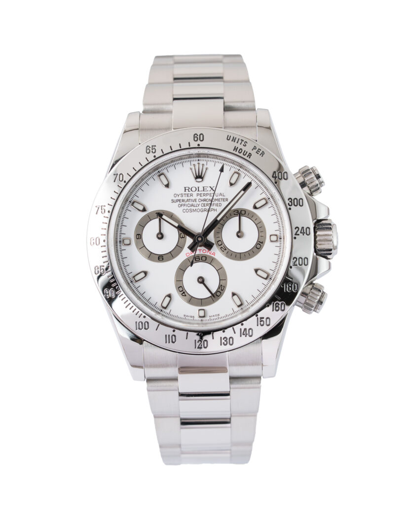 brand: Rolex Reference: 116520 Model: Daytona case MATERIAL: Steel strap: Bracelet case Size (MM): 40mm Dial colour: White Bezel: Steel Year: 08/2013 Condition: Excellent Box papers : Paperwork/box