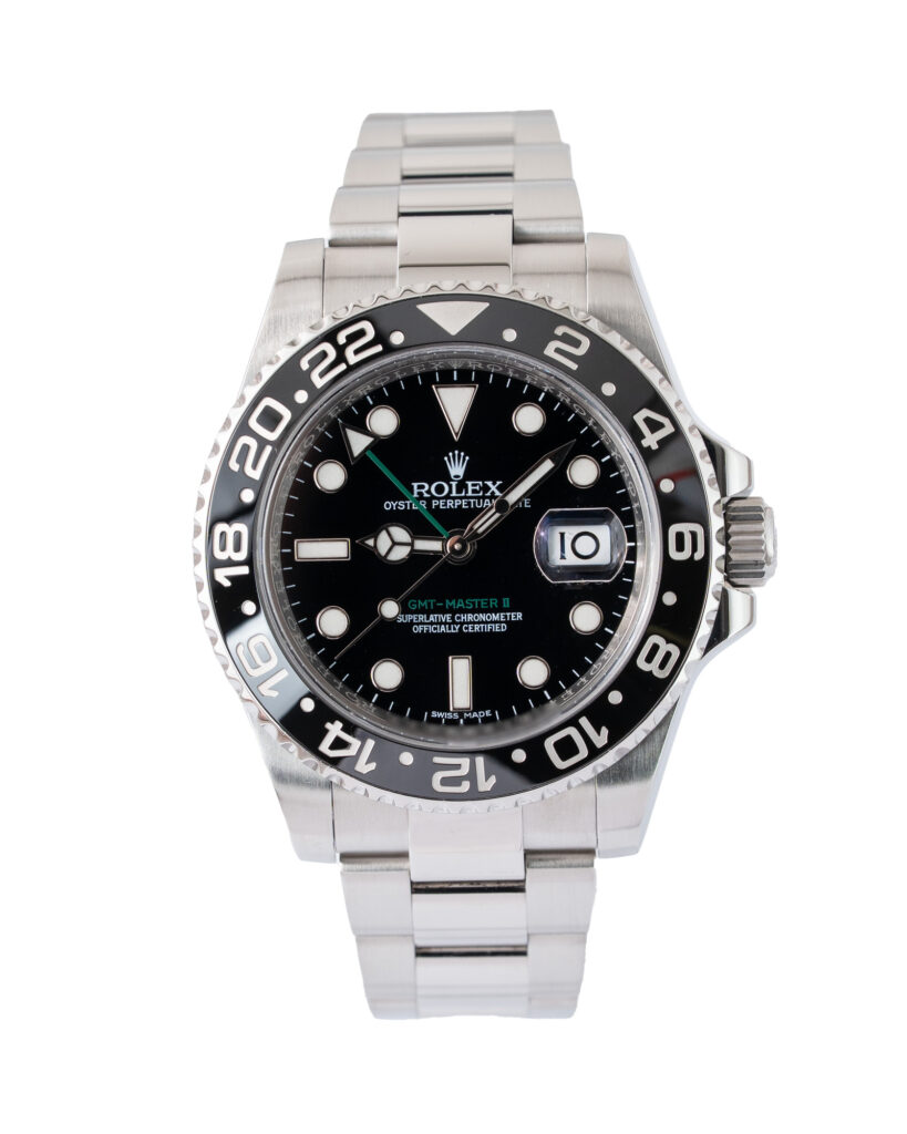 brand: Rolex Reference: 116710LN Model: GMT-Master II case MATERIAL: Steel strap: Bracelet case Size (MM): 40mm Dial colour: Black Bezel: Ceramic Year: 12/2015 Condition: Excellent Box papers : Paperwork/box