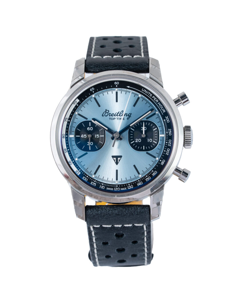 brand: Breitling Reference: A23311 Model: Top Time Triumph case MATERIAL: Steel strap: Leather case Size (MM): 41mm Dial colour: Blue Bezel: Steel Year: 08/2022 Condition: Unworn Box papers : Paperwork/box
